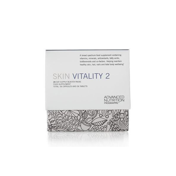 Advanced Nutrition Programme Skin Vitality 2 ensures adequate levels of nutrients to support a healthy mind and body. A broad spectrum supplement, it contains vitamins, antioxidants, minerals, fatty acids, herbal extracts, bioflavonoids and co-factors. Advanced Nutrition Programme Skin Vitality 2 provides essential nutrients needed for healthy skin, hair and nails while acting as a base line dietary support vitality.